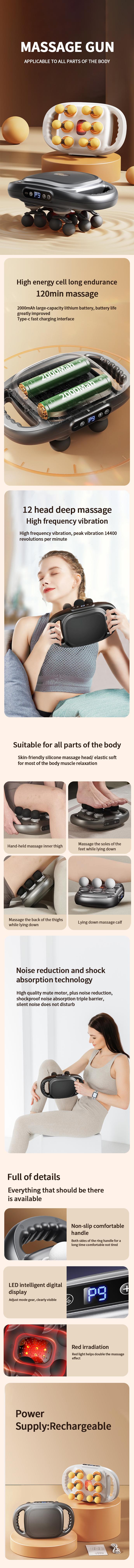 Equipped with 12 heads, this massage gun provides comprehensive coverage. Its user-friendly design allows for easy operation, ensuring comfort during use. Say goodbye to muscle pain with this efficient and effective massage solution. Perfect for home or professional settings.